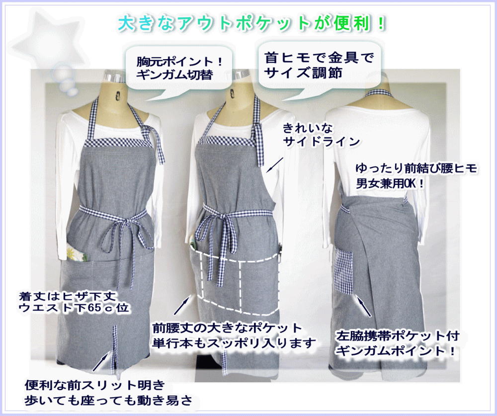 日本サイズの9号です 商品創りコンセプト 普段着もお洒落で楽しい毎日を イメージしてデザインをしています 大人可愛いアイテムを中心に カフェエプロン・エプロンドレスなど いろんなサイズ の方に 動きやすく、着易いデザインを フリーサイズで提案します ジャ ケット・ボトムなどに使われる素材を使い 上質で洗濯機洗いによるダメージの少ない縫製 丈夫な縫い目、裁ち切りを見せない丁寧な仕様 オリジナル・ハンドメイドの魅力 工場直接出荷だからできるサービス お直し、サイズオーダー詳細はコチラ・大きなポケットでドラえもん気分になれます。